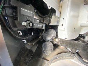フェンダライナーを外すと、純正のホーンやセンサーが