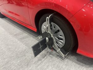 タイヤに取り付けたターゲットを機材が読み取り