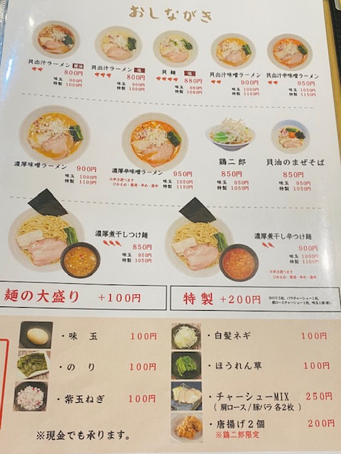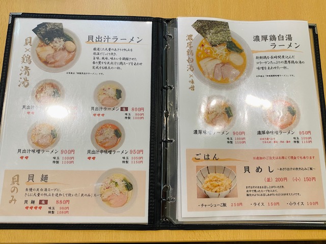 貝出汁ラーメン(塩)と濃厚味噌ラーメンをチョイス。