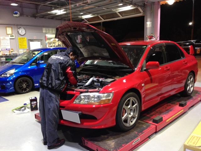 柳原が珍しい赤エボの納車整備をしてます。