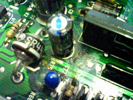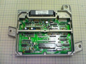 外したECUを開けてみると、メインコネクター付近のコンデンサーから