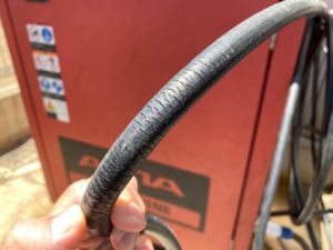 高圧ホースが劣化してヒビ割れしていて、水道圧でも