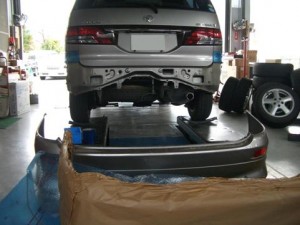 先日、後のブロックにきがつかずバンパーを傷つけてしまったT様のエスティマ。 任意保険の車輌保険に加入していると言う事でバンパー交換です。