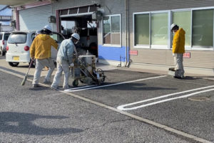 下書きの後は、道路に白線をひくマシンで職人が一発勝負!