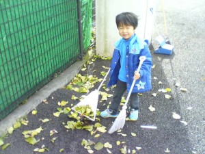 展示場の落ち葉拾いの手伝いをさせました。