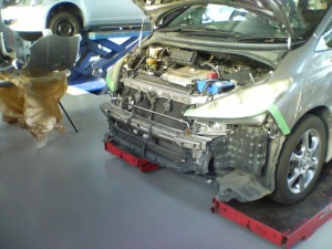 Y様エスティマが接触事故で入庫です。